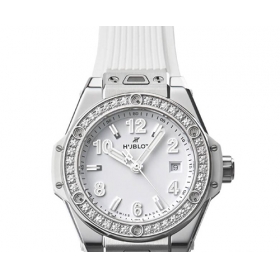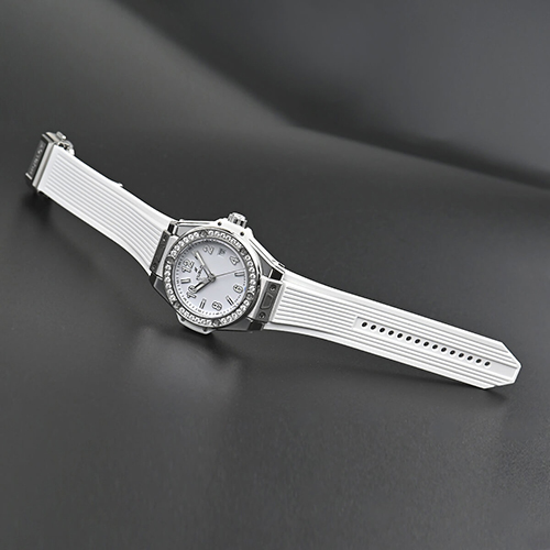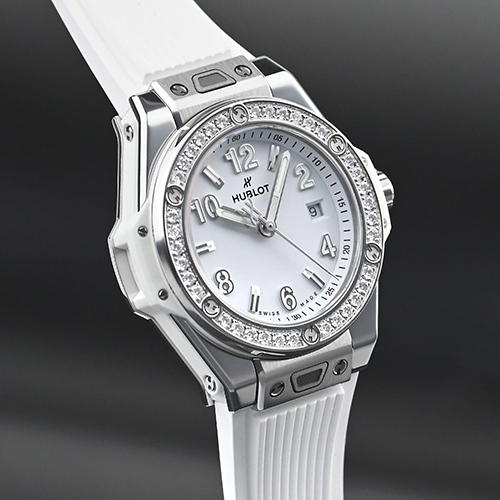 ウブロの腕時計の中でも、スポーティで迫力のあるデザイン、そして豪華さが特徴の「ビッグバン」。ホワイトで統一されたカラーがとても爽やかでおしゃれな1本です。ベゼルには贅沢にダイヤモンドがセッティングされていて、手元を鮮やかに彩ります。便利な「ワンクリックチェンジシステム」が備わっているので、ラグについている台形のボタンを押すことで、女性でも簡単にベルト交換ができます。ケース径は33mmで、程よい存在感がありますので、シンプルなコーデのアクセントにもおすすめです。様々なデザイン、サイズが展開されているコレクションですので、大切な人とのペアウォッチとしてもお楽しみいただけます。