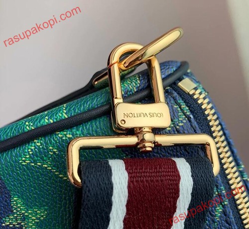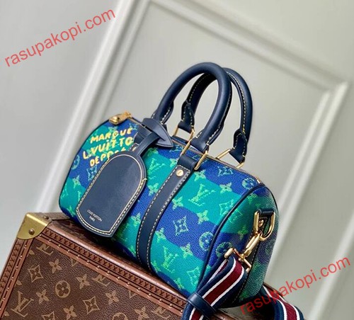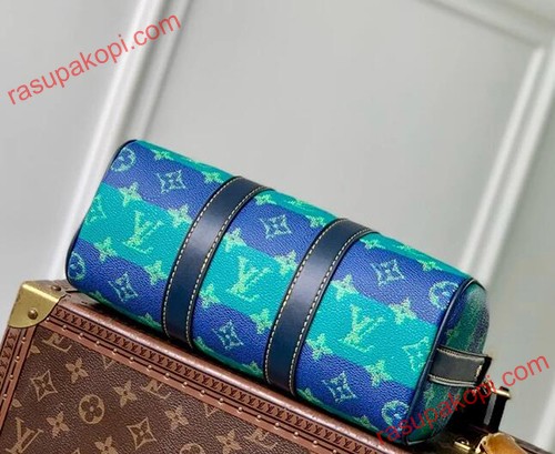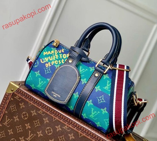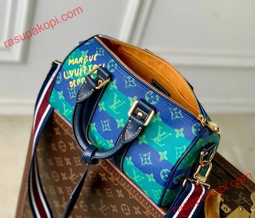 ストライプ柄のモノグラム・ヘリテージ キャンバスを使用した、スタイリッシュなシティバッグ「キーポル・バンドリエール 25」。サイドのバンドとトップハンドルに、コントラストステッチを施したネームタグが映えます。ファレル・ウィリアムスのサインである「Marque L. Vuitton Deposee」エンブレムは、メゾンのダミエ・パターンに初めて用いられました。取り外し可能なストライプストラップで、ショルダーバッグとしてもお使いいただけます。
