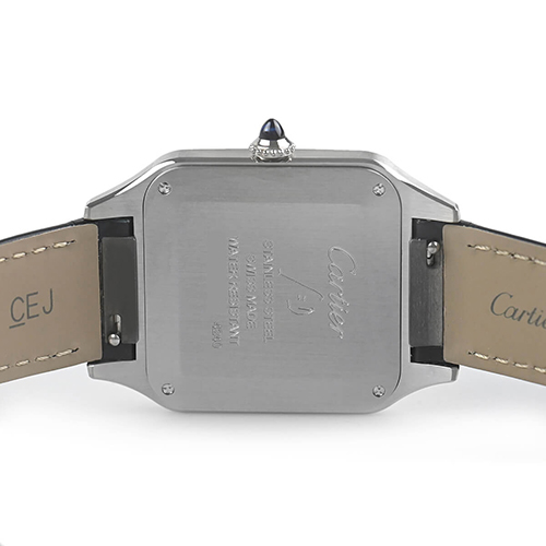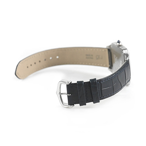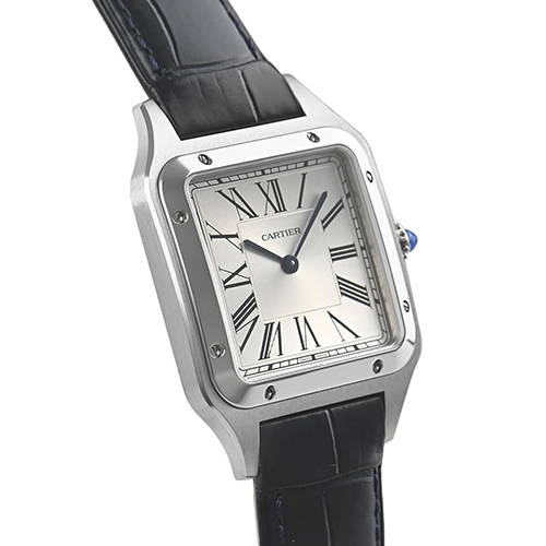 文字盤のローマインデックスとその外周に描かれた四角のレイルウェイ分目盛はカルティエウォッチを特徴づけ、またベゼル部分にはサントスウォッチ特有のビスモチーフが施されます。