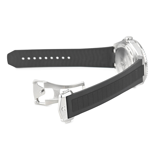 マット仕上げのブラックダイアルには、ホワイトのスーパールミノヴァを塗布したロジウム仕上げの針とインデクスをレイアウト。ホワイトの転写文字と、同じくホワイトの4つのアラビア数字が配されています。