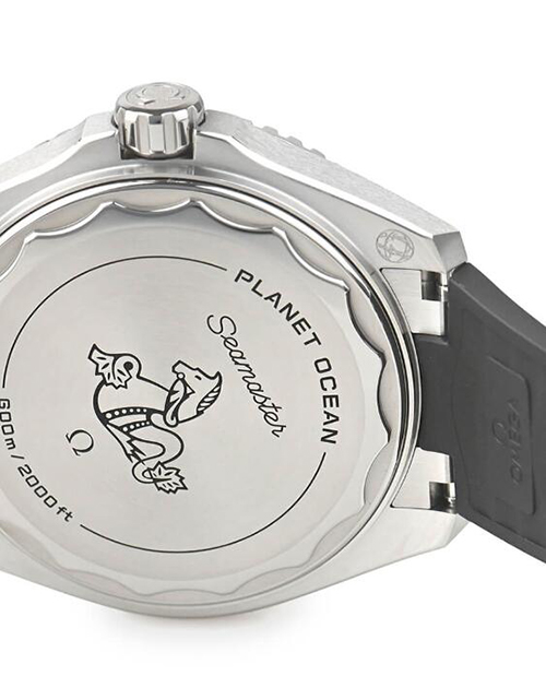 コーアクシャル マスター クロノメーター キャリバー8912搭載。ステンレススティール製のコマがケースと繋ぐ、フォールディングクラスプ付きのブラックラバーストラップが合わせられています。時計を裏返すと、ポリッシュ&ブラッシュ仕上げのグレード5チタン製ねじ込み式ケースバックに、オメガの有名なシーホースのエンブレムを見ることができます。