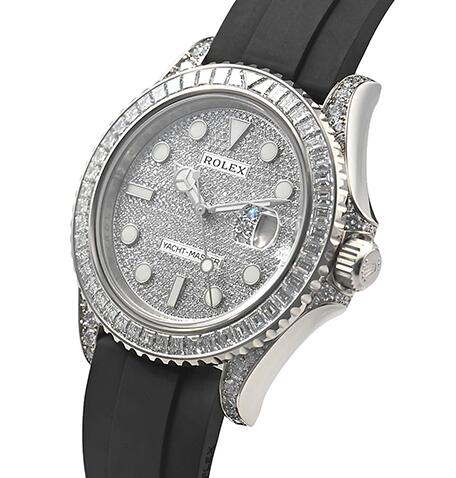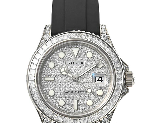 このモデル同リファレンスで2つの文字盤が存在し、ゴージャスな全面ダイヤモンドとノーマルの黒文字盤が存在する為、使うシーンを選ぶ1本ですね。細かい部分では、ベゼルの12位置の部分のダイヤモンドも逆三角形の物を使用するこだわり様です。